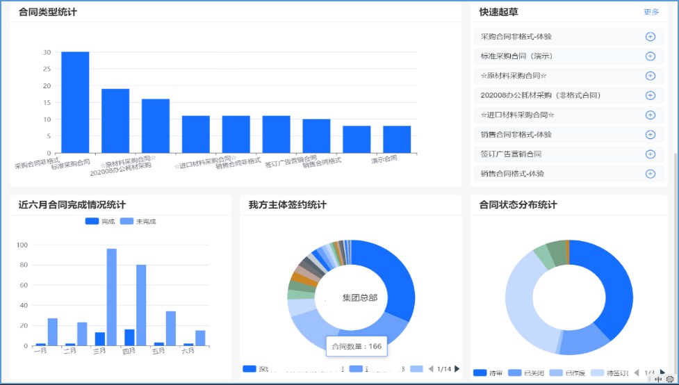 合同全過程一張圖,全面掌握從起草、審批、用印到歸檔的相關(guān)數(shù)據(jù),完全滿足合同監(jiān)管部門、承辦部門各角色人員管理需求。