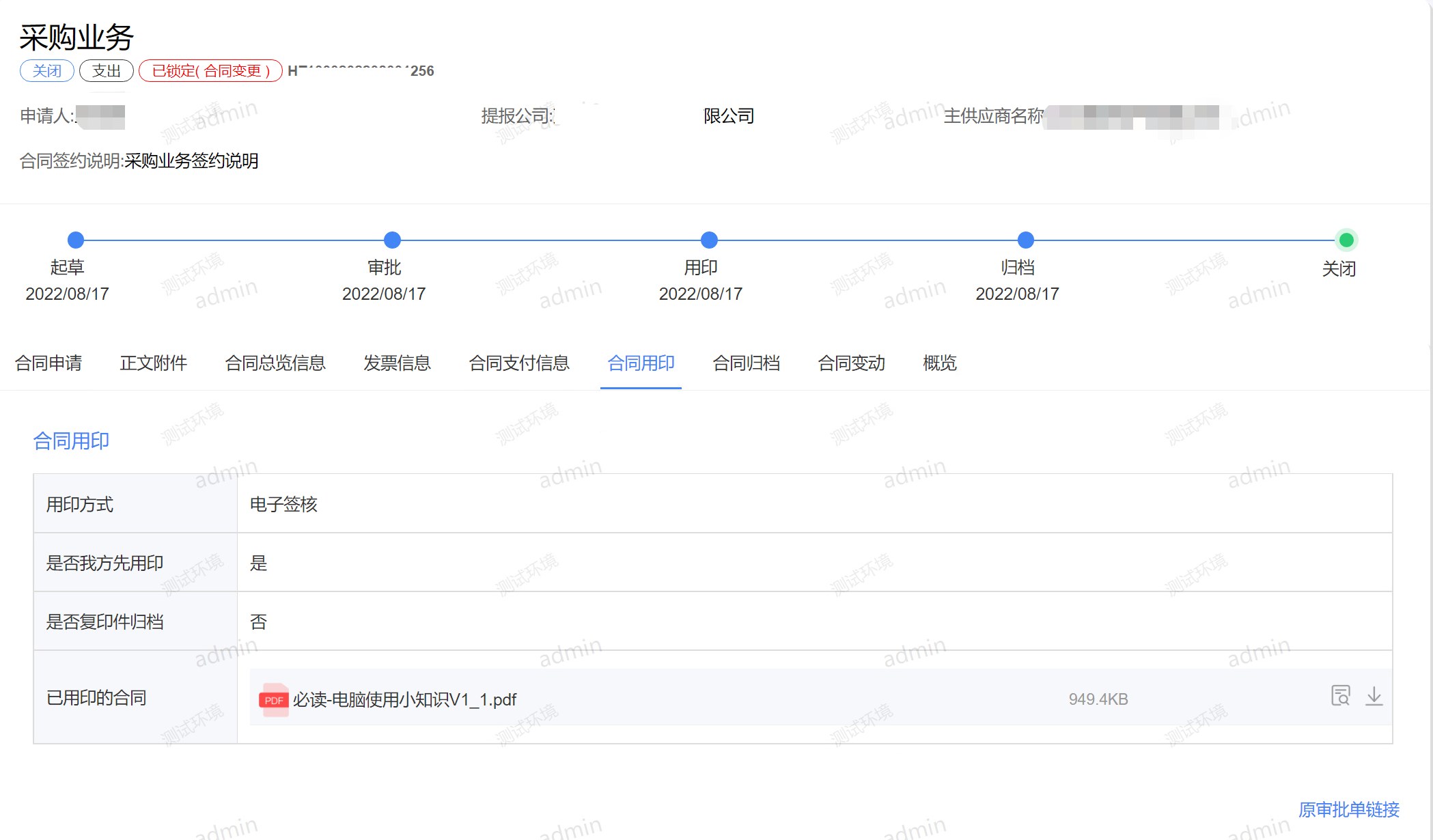 支持線下實體印及電子簽章。合同審批結(jié)束后,將發(fā)起用印待辦,申請人提交電子簽核,法務(wù)人員進(jìn)行電子簽署后,對方人員進(jìn)入電子簽核系統(tǒng)簽署。