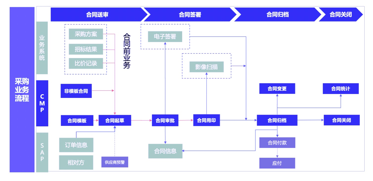 實現(xiàn)SAP與CMP系統(tǒng)互通互聯(lián),針對采購業(yè)務(wù),關(guān)聯(lián)合同送審及采購方案,付款條款標(biāo)準(zhǔn)化,供應(yīng)商風(fēng)險預(yù)警,詢比價記錄互聯(lián)等。