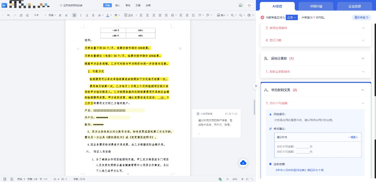 人工審核作業(yè)負(fù)擔(dān)大,通常法務(wù)人均每天審核超30份,占用了大量的精力;風(fēng)險識別、信息一致性等重要內(nèi)容完全依賴人工專業(yè)性和責(zé)任心,難以全面控風(fēng)險。