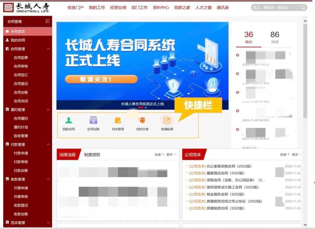 主界面配備便捷的快捷欄,包括“我的合同”、“合同臺賬”、“范本管理”、“相對方庫”、“快速起草”、“待辦/待閱”以及“法律法規(guī)”、“制度及授權”、“公司范本列表”等功能,讓用戶能夠迅速找到并開展所需工作。