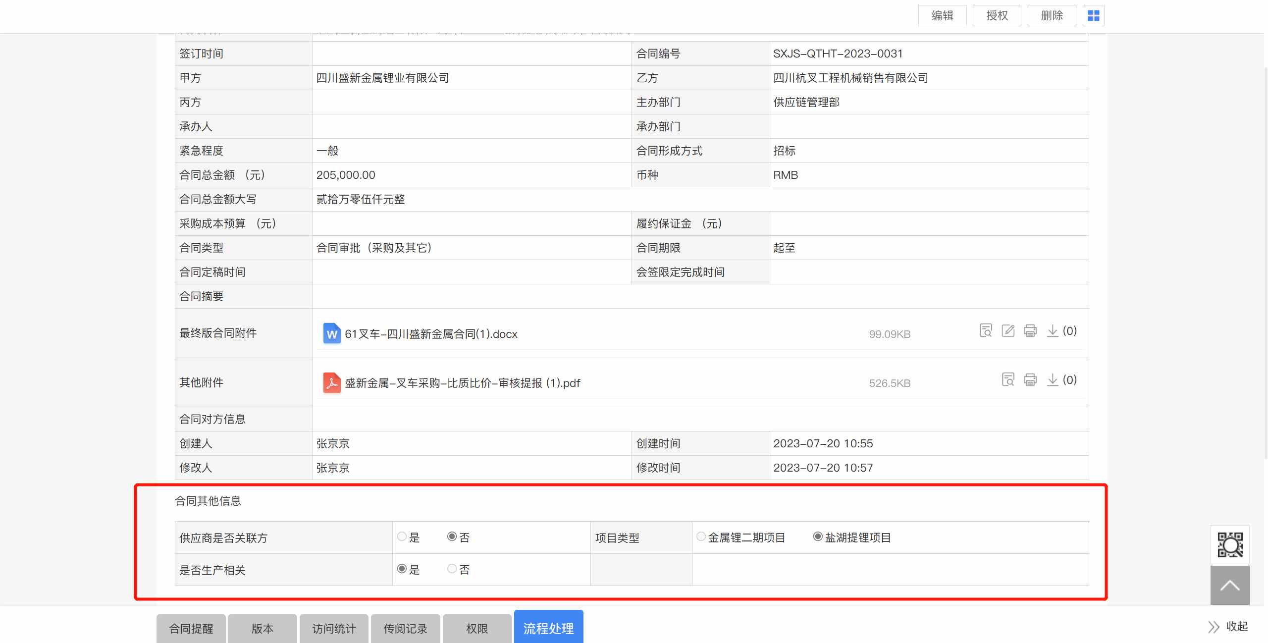通過附件轉(zhuǎn)換以及二維碼水印的雙重安全保障,盛新鋰能的合同管理從系統(tǒng)功能層面,在審批以及比對的應用場景遏制了合同被篡改偽造的風險。截止今年7月,盛新鋰能在藍凌合同管理系統(tǒng)應用的流程將近五百個。