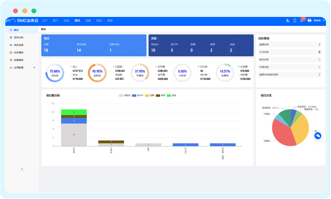 以數(shù)據(jù)服務(wù)為特色的新型民間智庫。通過BMC對整個項(xiàng)目的啟動、規(guī)劃、執(zhí)行、監(jiān)控和收尾等過程進(jìn)行有效組織、協(xié)調(diào)與控制,同時貫穿了客戶、合同、財務(wù)報銷等模塊,實(shí)現(xiàn)了項(xiàng)目的毛利核算。