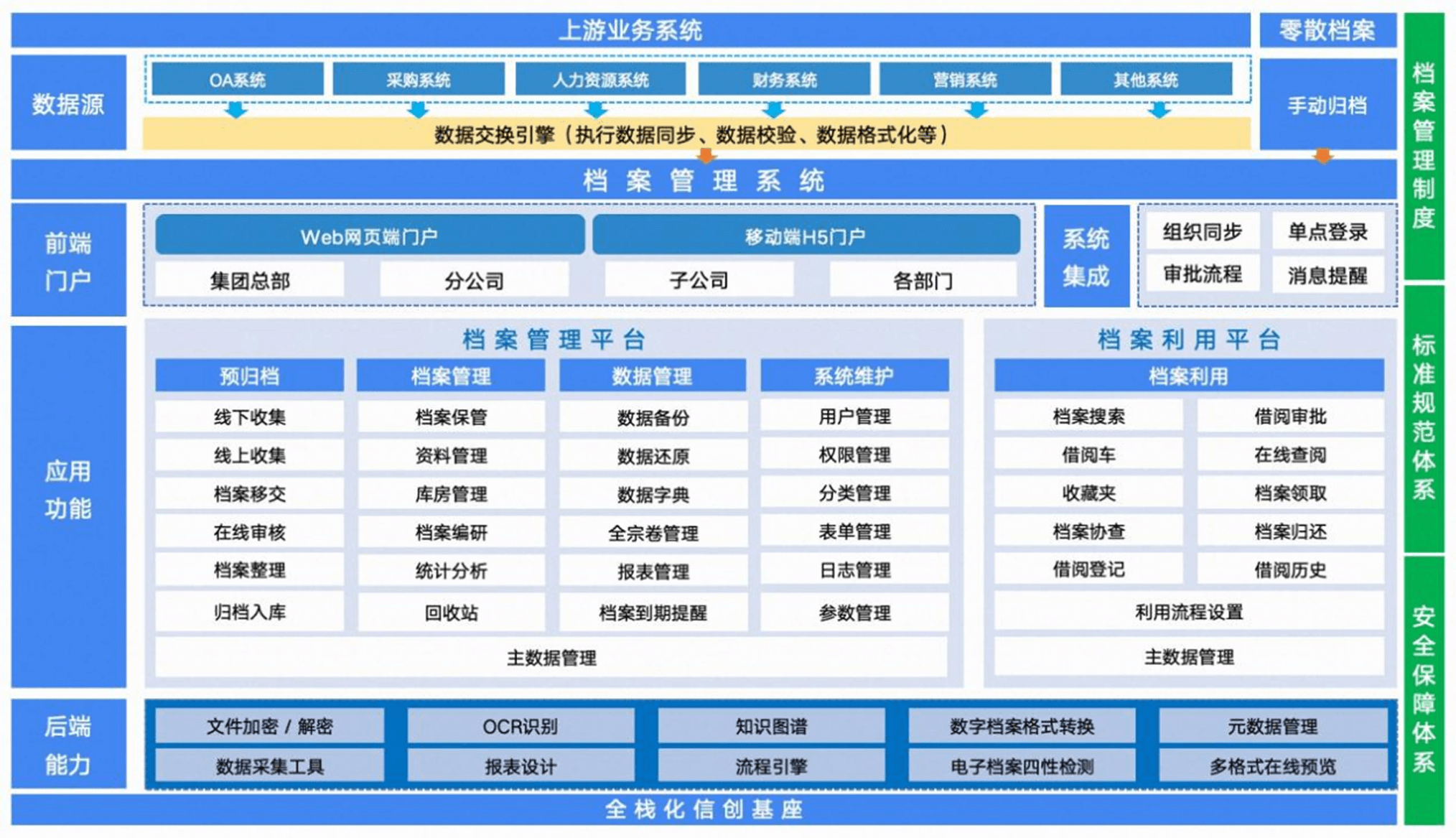符合國家、行業(yè)標(biāo)準(zhǔn),支撐管理制度流程E化,保障所有管理行為標(biāo)準(zhǔn)化;通過系統(tǒng)的輔助,進一步規(guī)范檔案業(yè)務(wù)流程,讓檔案應(yīng)歸盡歸、管理全面合規(guī)