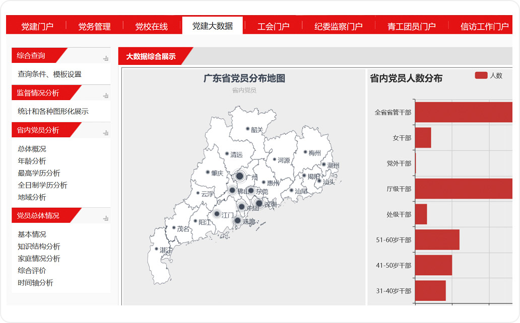 支持對系統(tǒng)內(nèi)的各類數(shù)據(jù)自動(dòng)、快速抓取,多圖表的展示黨委發(fā)文、黨課學(xué)時(shí)、學(xué)費(fèi)繳納、黨員構(gòu)成、創(chuàng)新活動(dòng)等數(shù)據(jù),幫助書記掌握黨建最新動(dòng)態(tài)、科學(xué)決策,便于統(tǒng)籌安排整個(gè)企業(yè)的黨建工作。