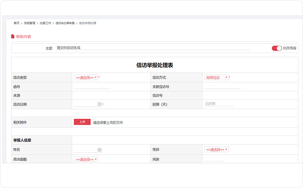 將信訪流程全程在線化,支持在閱讀完“信訪指南”后一鍵發(fā)起“舉報(bào)管理”,受理人在收到相關(guān)待辦后,填寫處理信息,舉報(bào)人可隨時(shí)查看進(jìn)度,讓信訪全過程留痕,便于各類信訪舉報(bào)件高效處理。