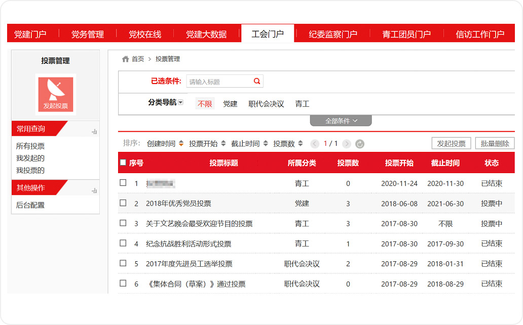 針對國企黨紀(jì)團(tuán)群工作中投票事項(xiàng)較多,線下投票費(fèi)時(shí)費(fèi)力的情況,采用在線問卷與投票管理,輕松完成工會(huì)選舉、活動(dòng)投票等工作,統(tǒng)計(jì)結(jié)果更快速,更透明。