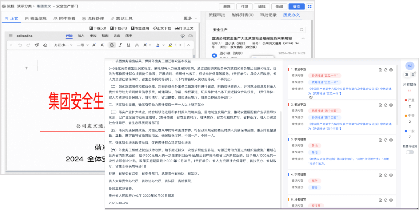 提供公文起草、在線編輯、正文清稿、套紅打印、流程審批、公文發(fā)布等全生命周期管理,適配國產化“流版簽”軟件,更高效、更安全