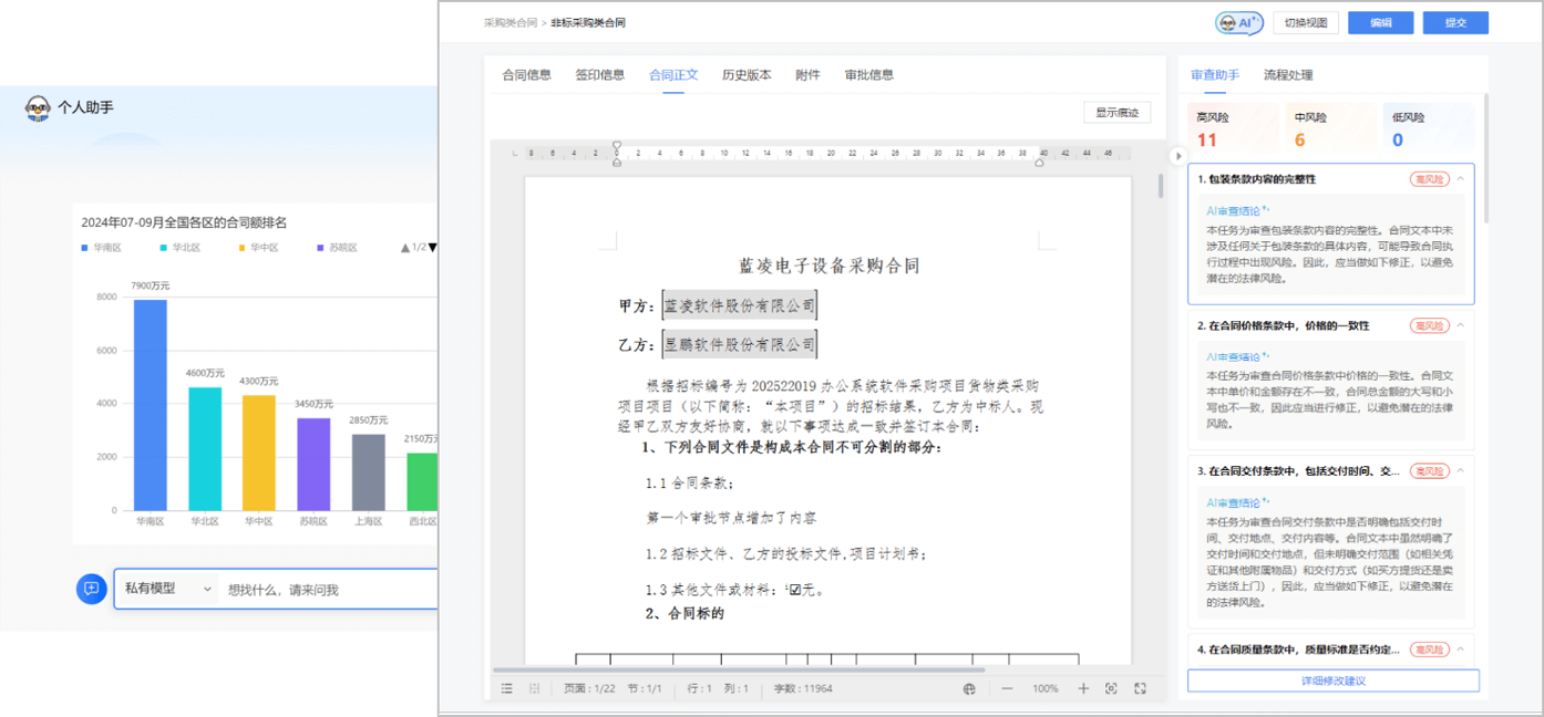 建立覆蓋合同起草、審批、簽訂、履約、歸檔等數(shù)智化全流程管理體系,融合業(yè)財稅,AI賦能,促進合規(guī)及標準化,提升效率