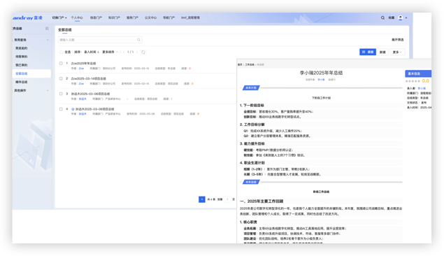 提供定期編寫工作計劃、檢查工作執(zhí)行的功能,可分成日、周、月、季、半年、年、其它總結,方便員工復盤工作,總結不足、保持進步