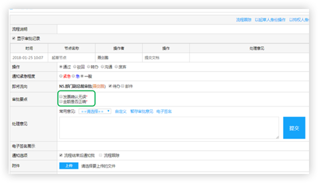 流程審批關鍵事項可配置審批要點,如發(fā)票確認是否無誤,金額是否正確?讓審批人清晰知識自己的關注點,落實審批責任,降低風險