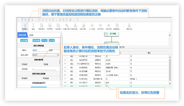 對流程的配置進行模擬流轉測試,根據必要條件自動判斷各條件下流轉路徑,便于管理員直觀檢測流程結果是否正確,同時節(jié)省更多時間