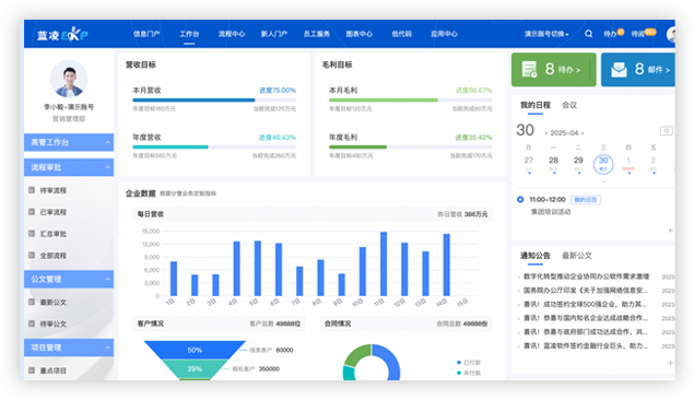 集中呈現(xiàn)企業(yè)業(yè)務、管理的核心數(shù)據,可視化多圖表方便領導全面了解運營狀況,科學決策,流程待辦集中推送,處理工作更高效