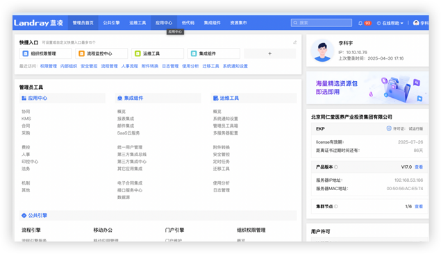 系統(tǒng)專屬管理員工作臺,支持快捷入口、智能提醒、鏈接產品社區(qū)(在線幫助)等功能,簡潔清晰,方便管理工作,讓系統(tǒng)運維更給力