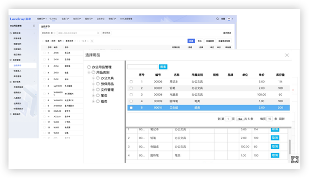 支持辦公用品管理,包括用品類別設置,入庫登記、維護、分配、領用等管理,并支持用品領用、出入庫查詢統(tǒng)計和EXCEL導入導出操作
