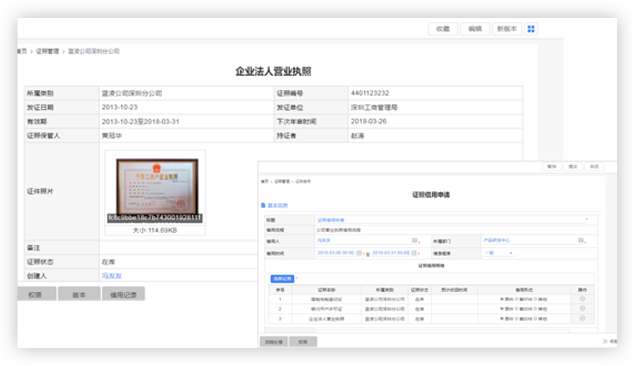 對營業(yè)執(zhí)照、機構代碼證、稅務登記證、個人職稱證等進行集中管理,覆蓋原件管理、證照外借、年審預警等功能,助力安全用,高效管
