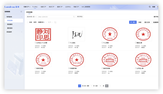 管理印章基本信息,實現(xiàn)印章全生命周期管理,包含物理印章和電子印章管理。支持對接私有化版的電子簽章系統(tǒng),讓用印用章高效安全