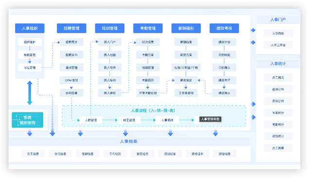 賦能企業(yè)人力資源管理,涵蓋人事組織、招聘、培訓、考勤、薪酬福利、績效考核及員工的入轉調離,優(yōu)化企業(yè)人事管理