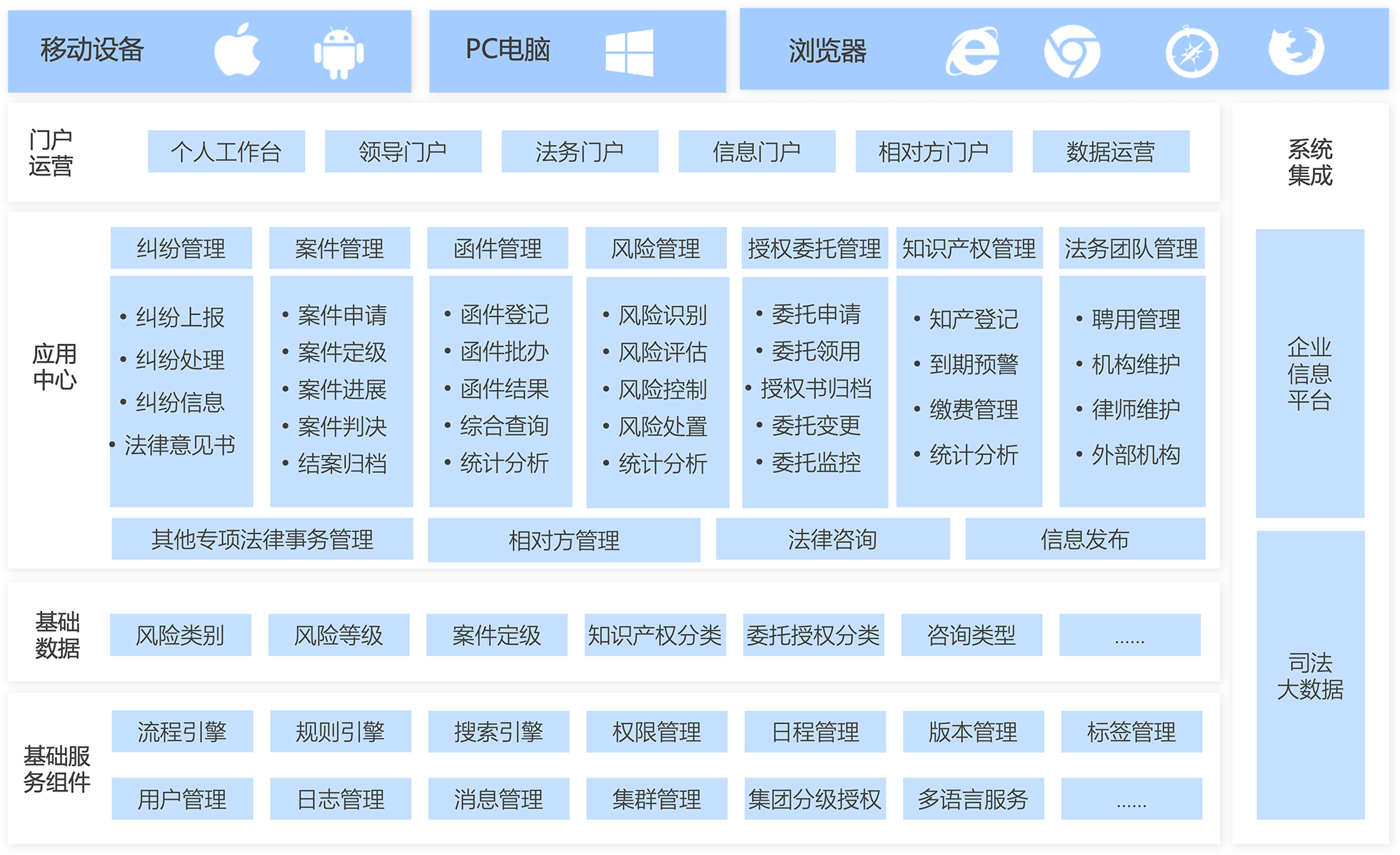 提供糾紛管理、案件管理、律師律所管理、風(fēng)險(xiǎn)管理、函件管理、授權(quán)委托管理、知識(shí)產(chǎn)權(quán)管理、法務(wù)知識(shí)管理等數(shù)字化工具,幫助企業(yè)建立法務(wù)共享服務(wù)中心,賦能業(yè)務(wù)發(fā)展。