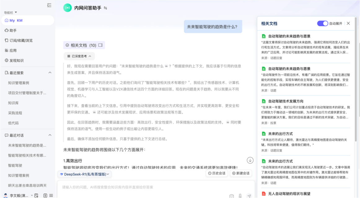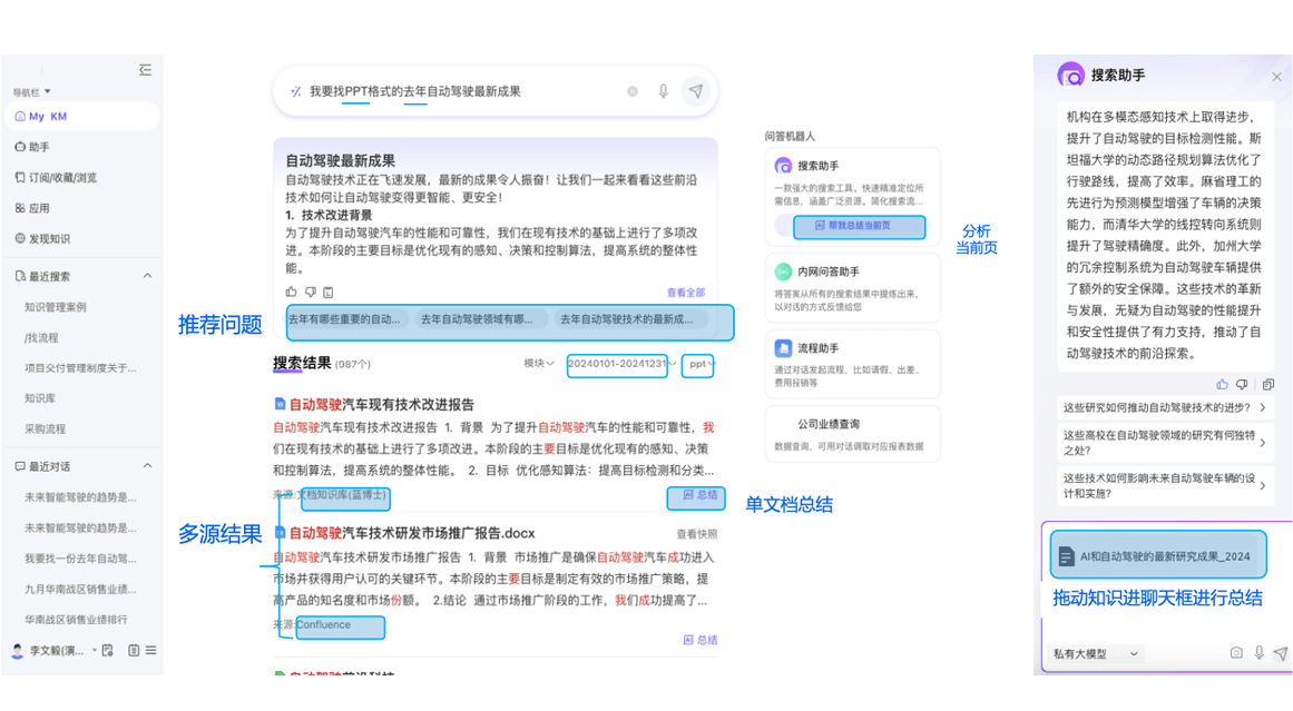 可支持語義搜索,可搜索到來自于OA等多個(gè)系統(tǒng)來源的知識,支持對單文檔、當(dāng)前所有搜索結(jié)果進(jìn)行總結(jié),快速、精準(zhǔn)獲取所需知識