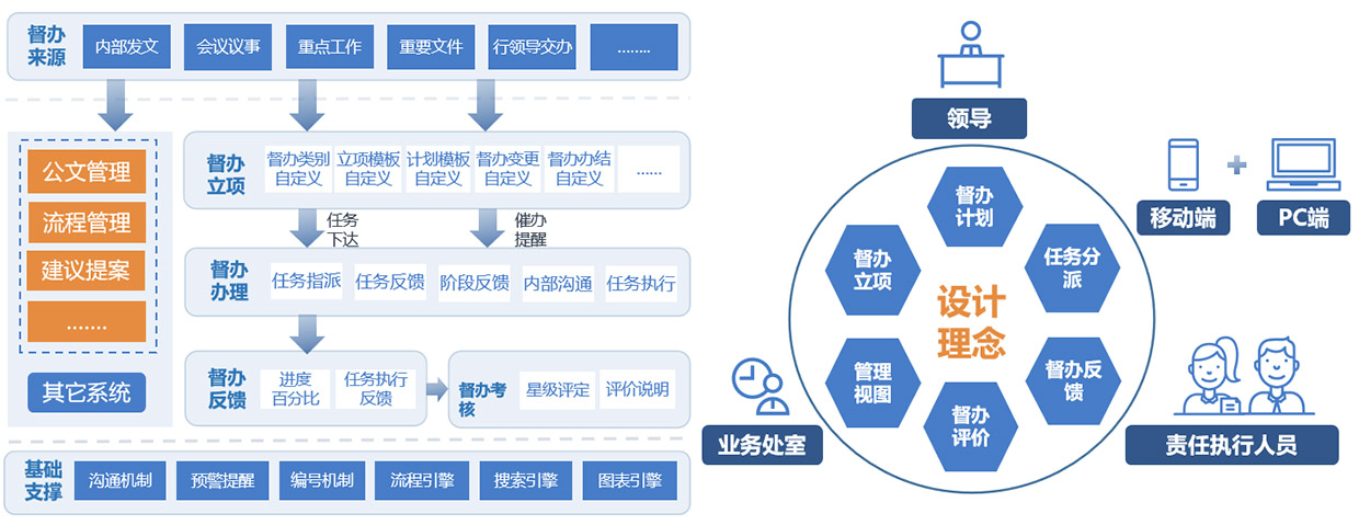 面向金融機構(gòu)的領(lǐng)導、業(yè)務(wù)處室、責任執(zhí)行人員,提供督辦新建、立項審批、制定計劃、任務(wù)指派、任務(wù)反饋到督辦考核的全生命周期管理