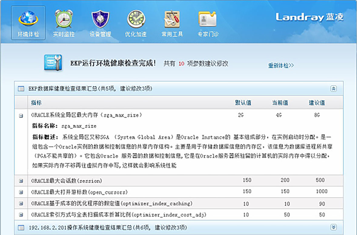 藍凌AGP健康監(jiān)控平臺可對EKP運行環(huán)境進行健康檢查、實時監(jiān)控、趨勢分析、數(shù)據(jù)分析等,助力對產(chǎn)品環(huán)境進行資源配置調(diào)整與優(yōu)化
