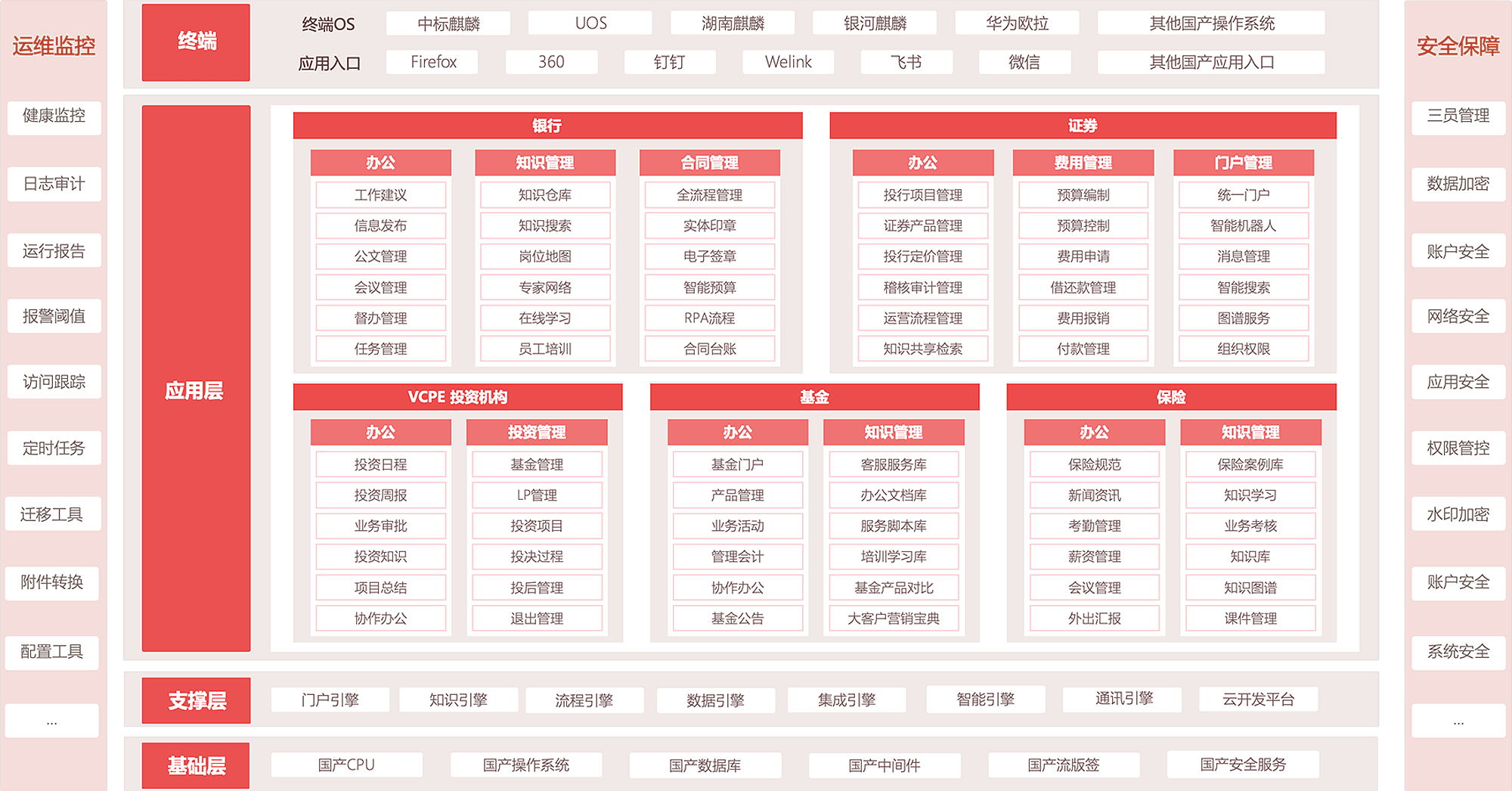 對現(xiàn)有產(chǎn)品架構(gòu)進行升級,完成了標準產(chǎn)品90+個模塊在信創(chuàng)產(chǎn)品中的適配性,完成20+個自研模塊的信創(chuàng)改造,完成50+類流程外接集成接口,滿足業(yè)務(wù)辦公需求,全面提升辦公效率
