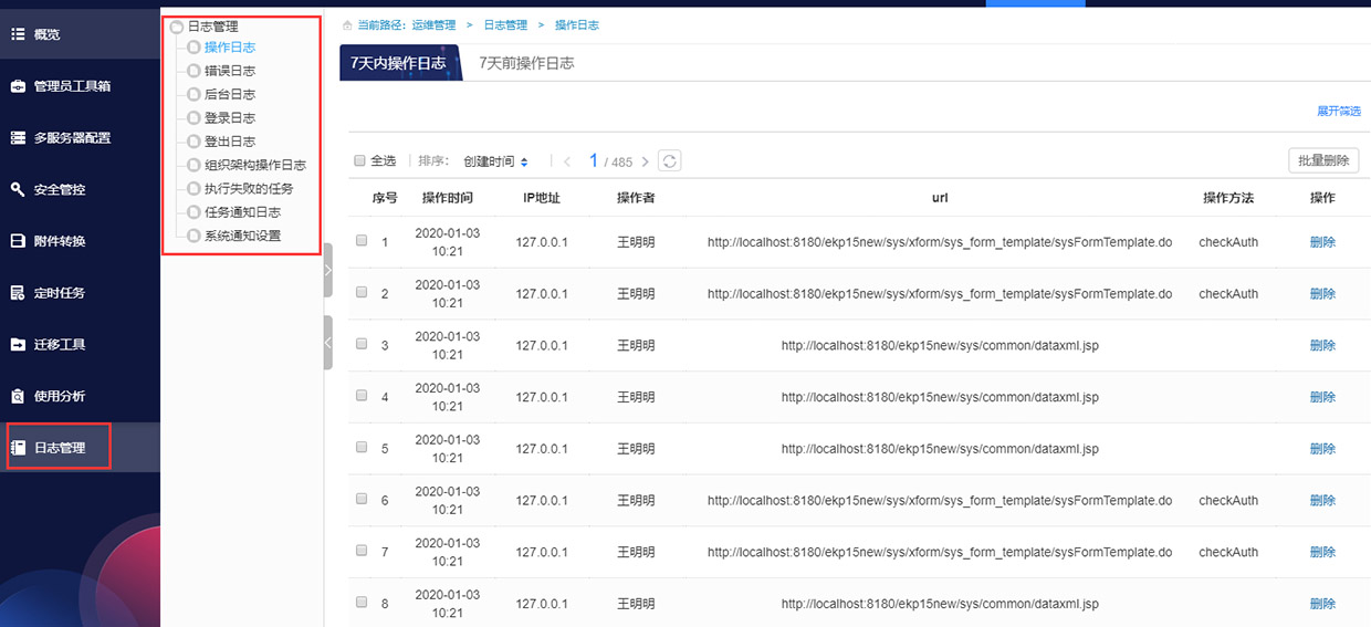 日志管理:進行分類日志管理,包括操作日志、錯誤日志、后臺日志、登錄日志等