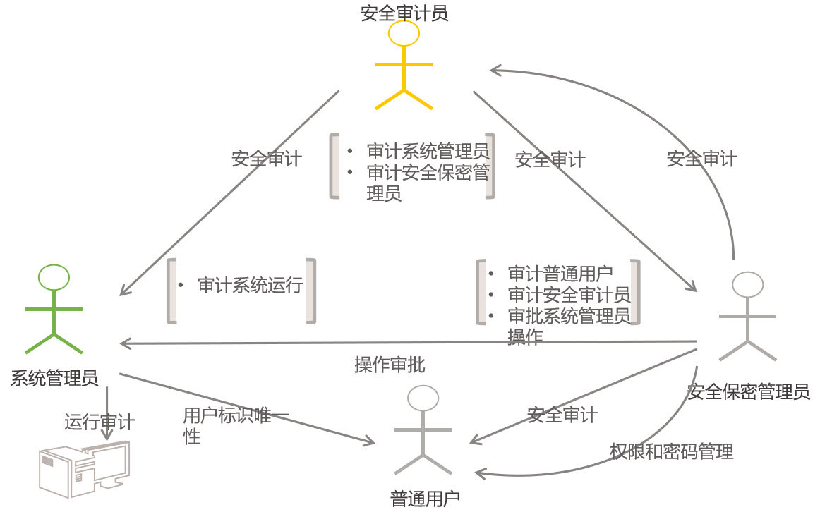 安全保密管理員:其權(quán)限包括審計安全審計員、審計普通用戶、審批系統(tǒng)管理員操作、管理用戶權(quán)限和密碼