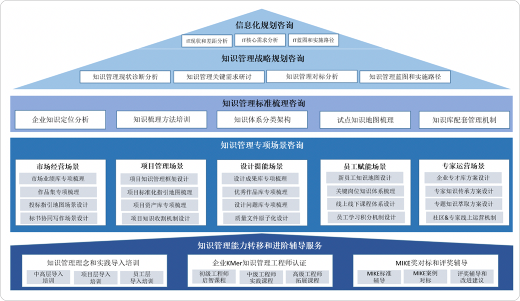 智慧設(shè)計院信息化規(guī)劃、知識管理規(guī)劃及應(yīng)用咨詢服務(wù)、KM工程師認(rèn)證培訓(xùn)、MIKE申報輔導(dǎo)等