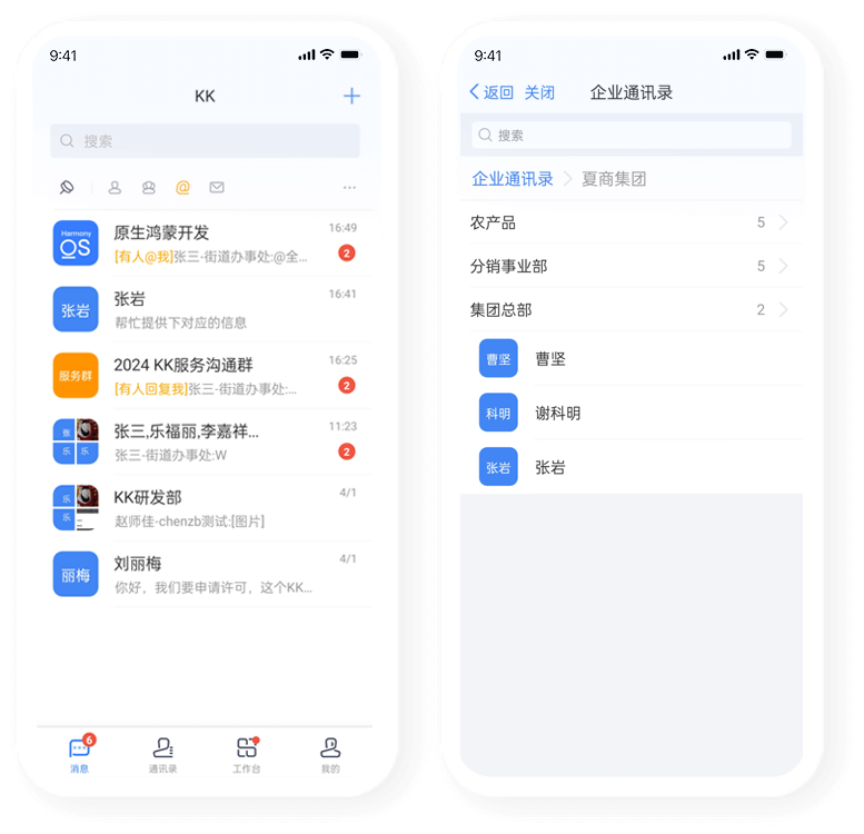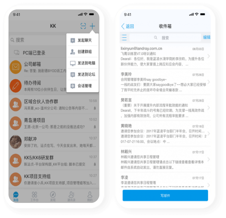 藍凌KK支持P2P、群聊、廣播;可通過應(yīng)用通知和公眾號消息觸達用戶;支持員工調(diào)動自動退群;水印/防截圖,保障信息安全;已讀/未讀等功能讓溝通更高效。