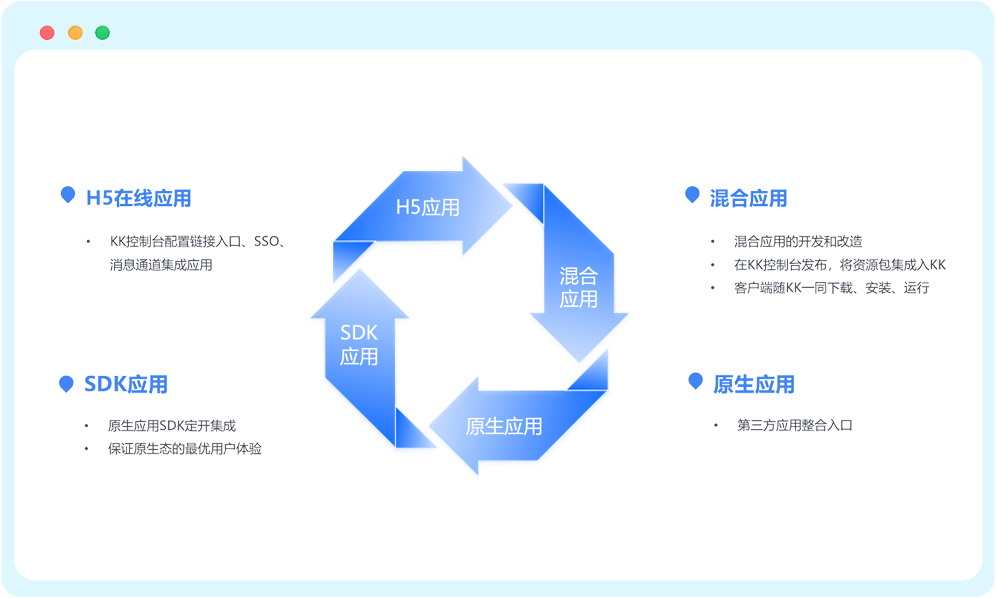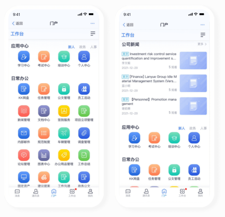 藍凌KK支持KK網(wǎng)盤、在線文檔,助力知識共享與協(xié)作;企業(yè)公眾號打造業(yè)務(wù)窗口,助力服務(wù)運,應(yīng)用中心連接內(nèi)外應(yīng)用,可拓展,讓多場景移動辦以更敏捷。