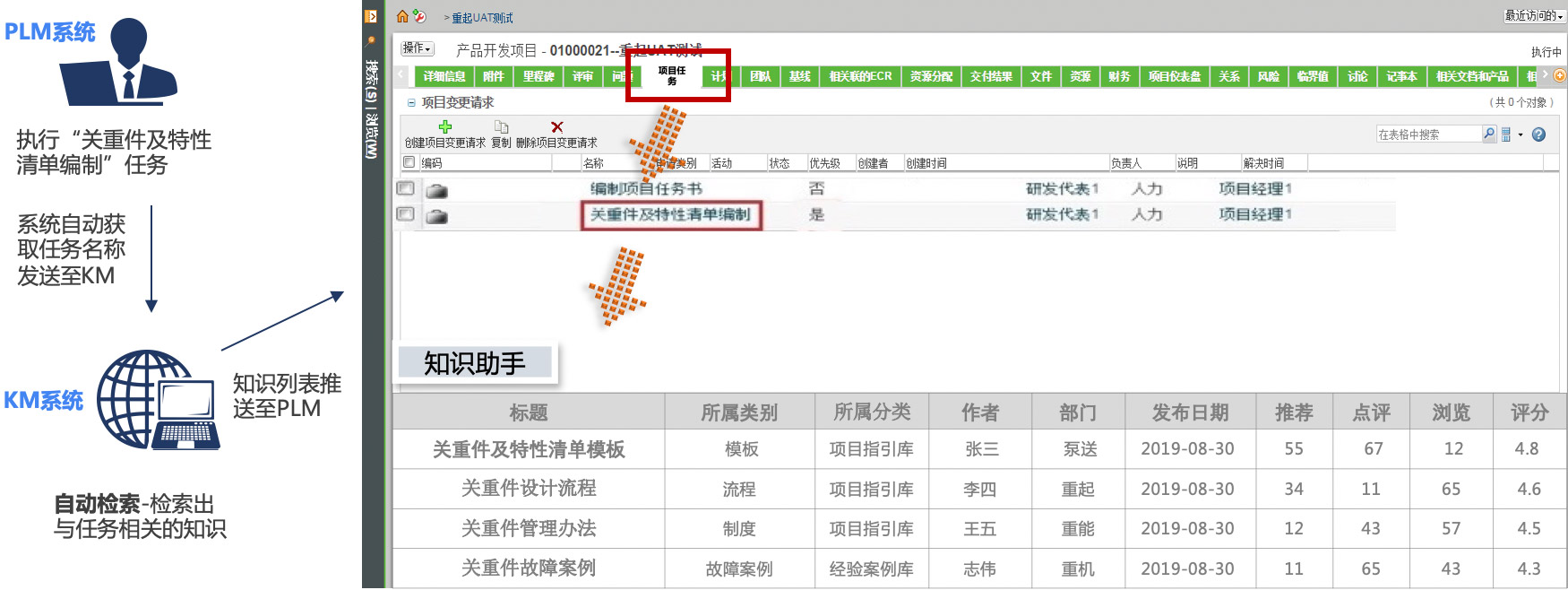 當(dāng)研發(fā)人員在研發(fā)業(yè)務(wù)系統(tǒng)中執(zhí)行任務(wù)時(shí),知識(shí)管理系統(tǒng)可自動(dòng)識(shí)別任務(wù)關(guān)鍵字,根據(jù)關(guān)鍵字自動(dòng)搜索整理相關(guān)知識(shí),推送知識(shí)至研發(fā)業(yè)務(wù)系統(tǒng)供研發(fā)人員查閱參考。