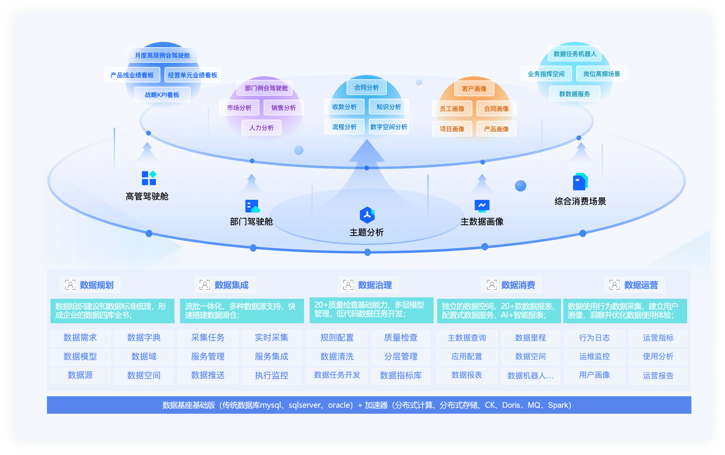 統(tǒng)一數(shù)據(jù)指標(biāo)及KPI數(shù)字化體系,建立戰(zhàn)略、經(jīng)營(yíng)、業(yè)務(wù)等多主題數(shù)據(jù)消費(fèi)場(chǎng)景,支撐經(jīng)營(yíng)洞察、運(yùn)營(yíng)提效、業(yè)務(wù)創(chuàng)新。