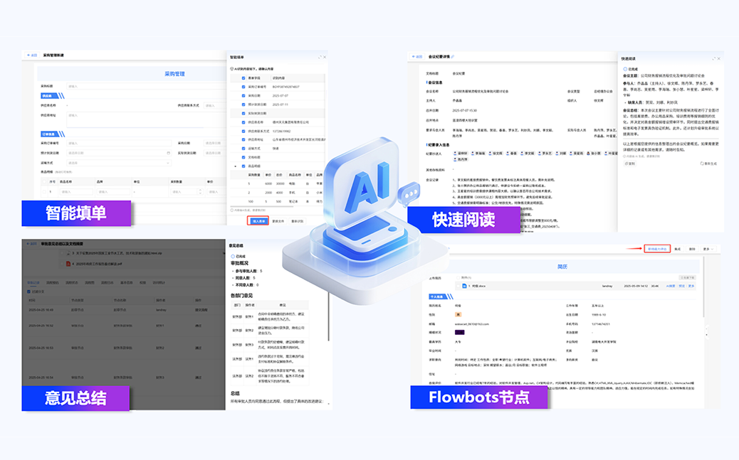 AI助力低代碼搭建多場景,開啟企業(yè)級數(shù)字化的“自動(dòng)駕駛”模式。智能設(shè)計(jì):AI 在線梳理管理需求,對齊業(yè)務(wù)目標(biāo),彌合需求與 IT 實(shí)現(xiàn)的鴻溝。智能搭建:對話式交互輔助,秒級完成數(shù)字化應(yīng)用設(shè)計(jì)搭建。智能優(yōu)化場景:支持字段、字體、大小調(diào)整及主題換膚。智能填單:自動(dòng)化提取填充附件信息,提升填單效率,加速業(yè)務(wù)流轉(zhuǎn)。智能寫作:快速生成富文本框架與初稿,輔助內(nèi)容擴(kuò)展,提效保質(zhì)降門檻。快速閱讀:精準(zhǔn)提煉關(guān)鍵信息,提升閱讀效率與信息轉(zhuǎn)化能力。