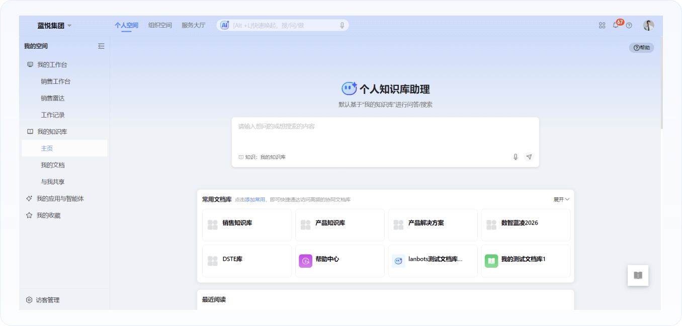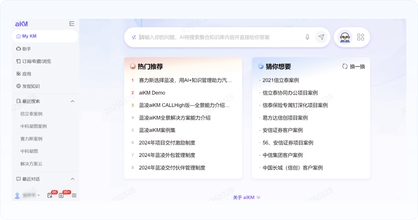 集合“最近搜索”“最近對話”“熱門推薦”“猜你想要”等內(nèi)容;支持搜索框快速搜索,或者一鍵喚起問答機(jī)器人,助力用戶高效查詢、獲取知識