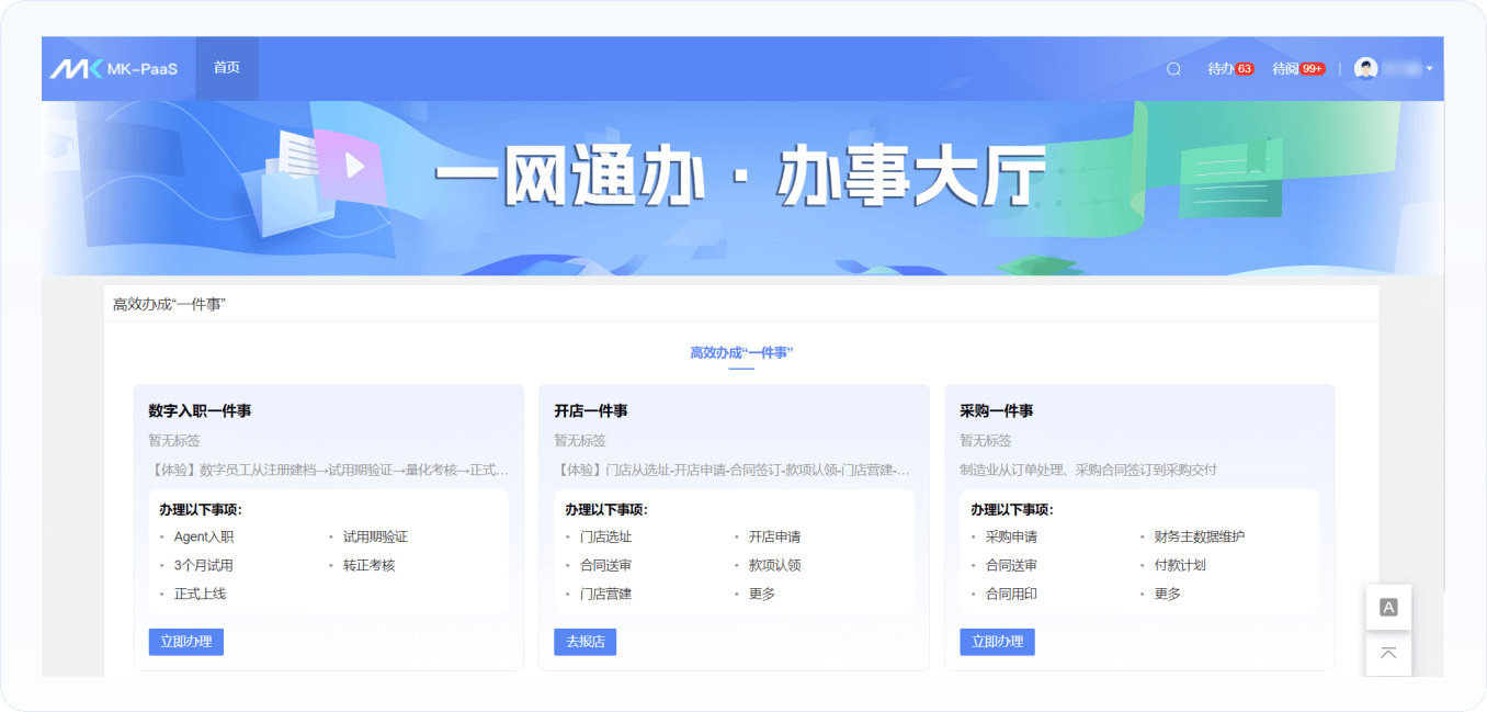 聚焦入職、采購、出差、開店等企業(yè)核心場景,實現(xiàn)業(yè)務(wù)一件事端到端流程閉環(huán),打通服務(wù)“最后一公里”。既是企業(yè)對外服務(wù)窗口,也是對內(nèi)提效的樞紐