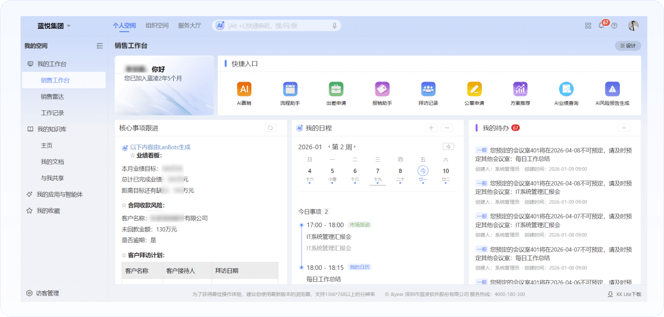 攜手藍(lán)凌搭建客戶經(jīng)理工作空間,拉通業(yè)績指標(biāo)、客戶信息等核心數(shù)據(jù),實現(xiàn)關(guān)鍵數(shù)據(jù)的可視化直觀呈現(xiàn);依托藍(lán)凌AI智能體平臺,搭建客戶拜訪推薦智能體、情報采集智能體等多個智能體,以智能工具助力客戶經(jīng)理高效推進(jìn)日常業(yè)務(wù)。