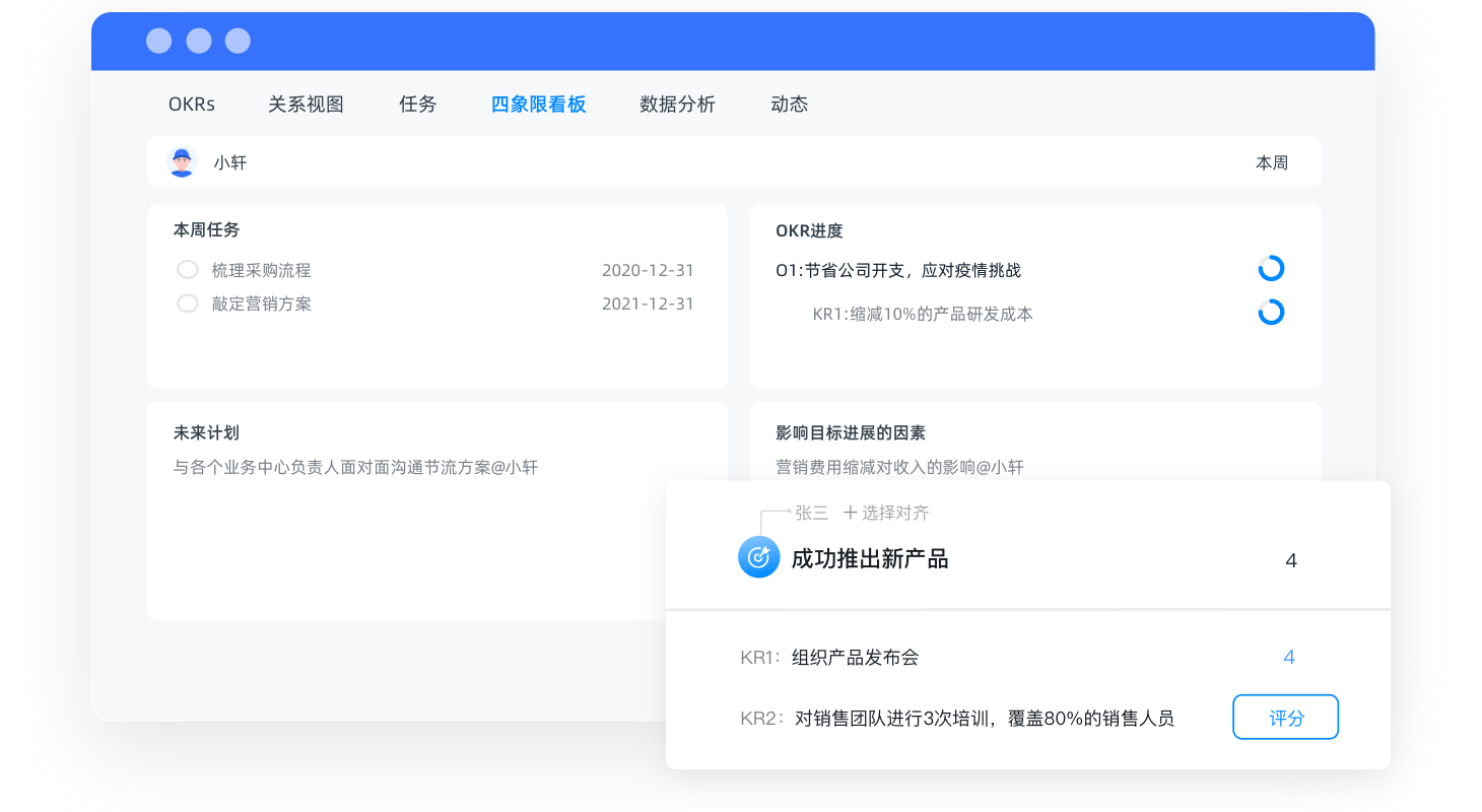 每周的復(fù)盤都能及時對任務(wù)和KR完成情況進(jìn)行全局式概覽,大大提升了團(tuán)隊的戰(zhàn)斗力。
