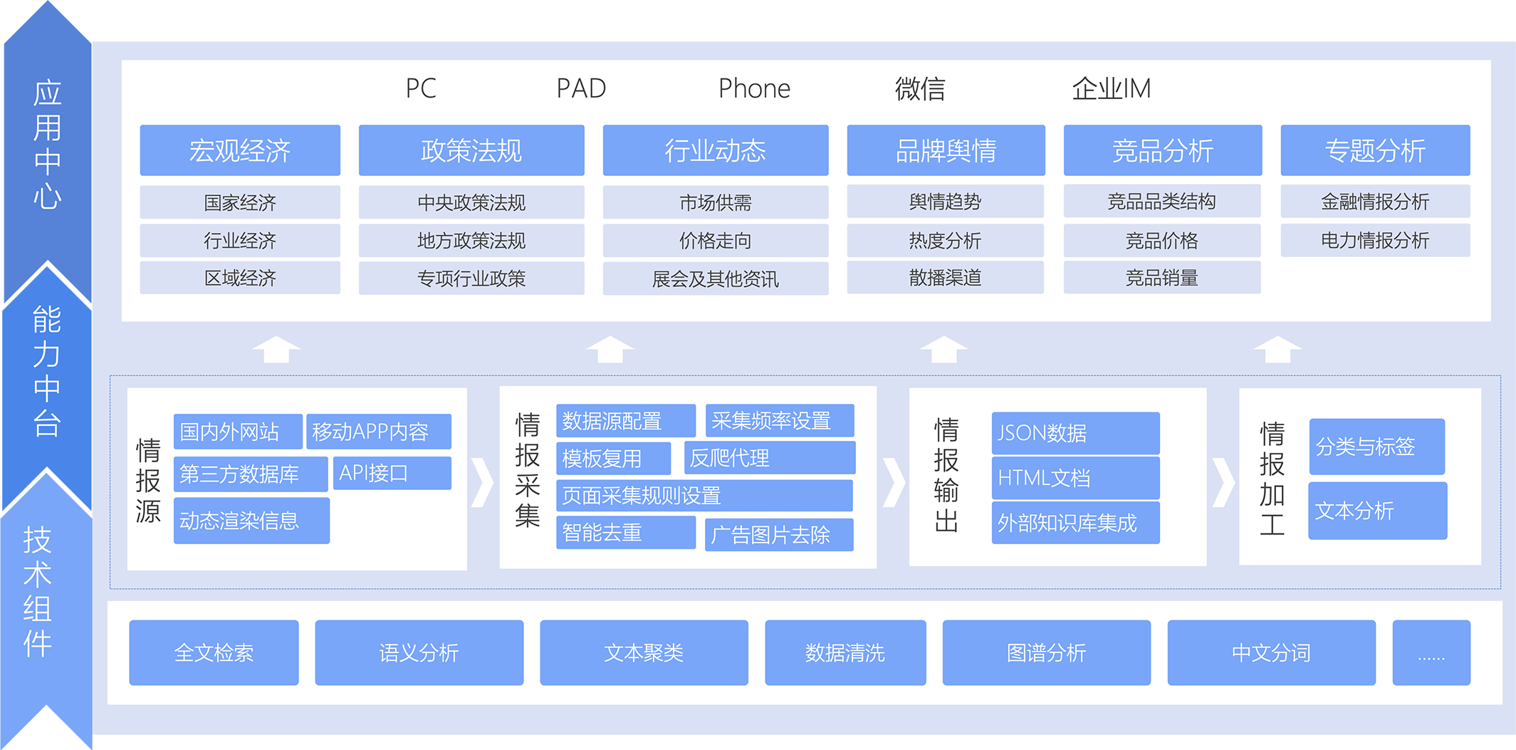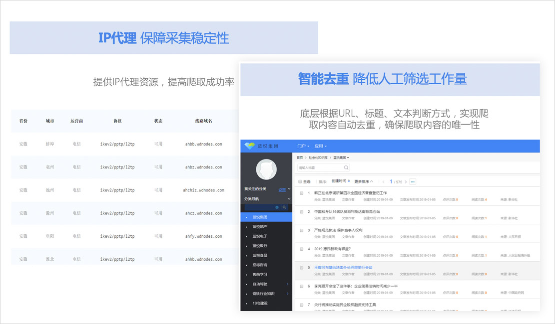 立外部情報(bào)資訊中心,對(duì)30+站點(diǎn)數(shù)據(jù)進(jìn)行自動(dòng)內(nèi)容爬取,覆蓋從行業(yè)供需和交易、國家監(jiān)管策略、企業(yè)運(yùn)營管理、法律法規(guī)、同行動(dòng)態(tài)五大方面的內(nèi)容形容外部知識(shí)庫,為業(yè)務(wù)線條提供有價(jià)值的知識(shí)服務(wù)