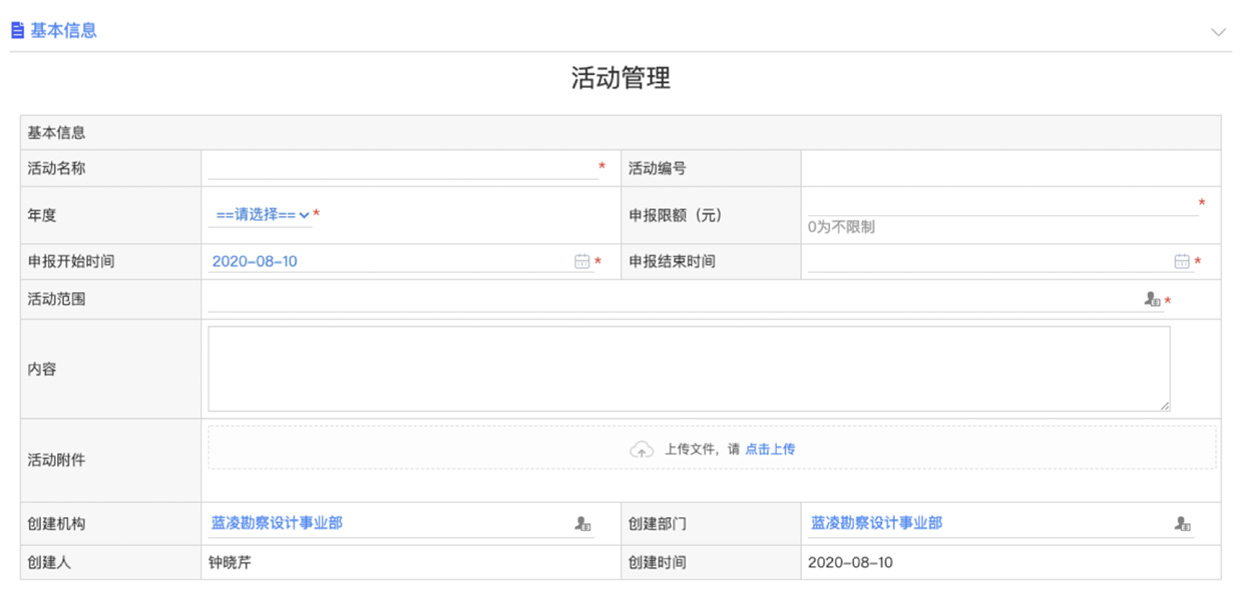 - 企業(yè)通過在線發(fā)布活動,設置可申報范圍、申報總金額、起止時間、活動評審規(guī)則、專家評審規(guī)則等,來規(guī)范、限制科研項目申報流程,保證后續(xù)操作的合規(guī)