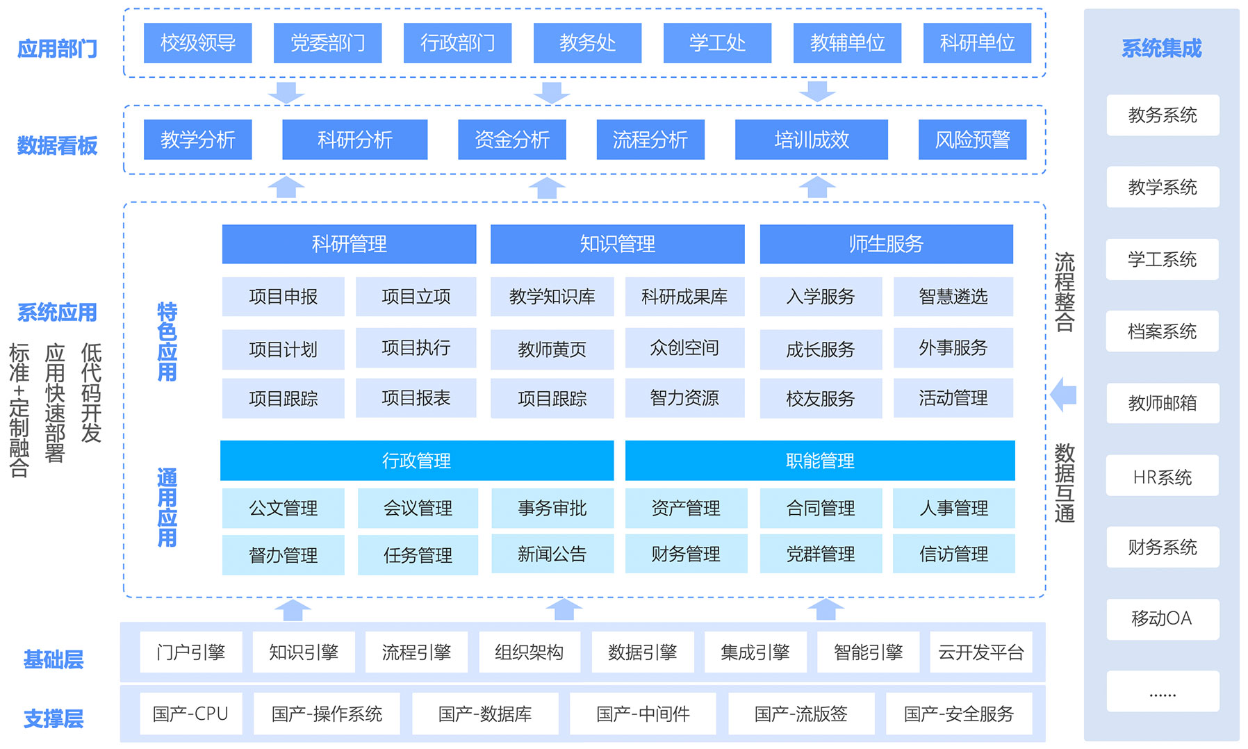 通過四大支撐系統(tǒng)(門戶系統(tǒng)、工作流引擎、文檔管理、系統(tǒng)管理),構(gòu)建公文管理、個人信息管理等七大功能模塊,提供靈活、穩(wěn)定、安全、高效的一體化智慧辦公,助力學(xué)校更好發(fā)展