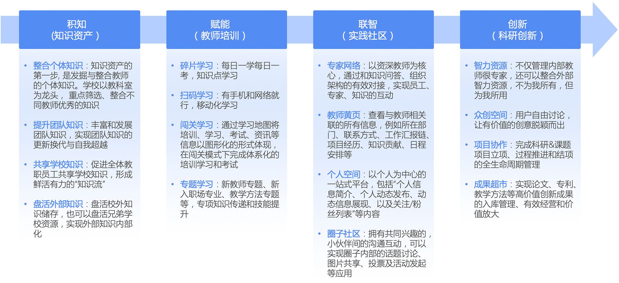 藍(lán)凌可助力高校搭建多個知識庫,將教育法規(guī)與政策、學(xué)校管理制度與流程、教師科研方法與成果、學(xué)科教學(xué)設(shè)計與題庫、師生成長檔案等進(jìn)行科學(xué)分類、統(tǒng)一管理