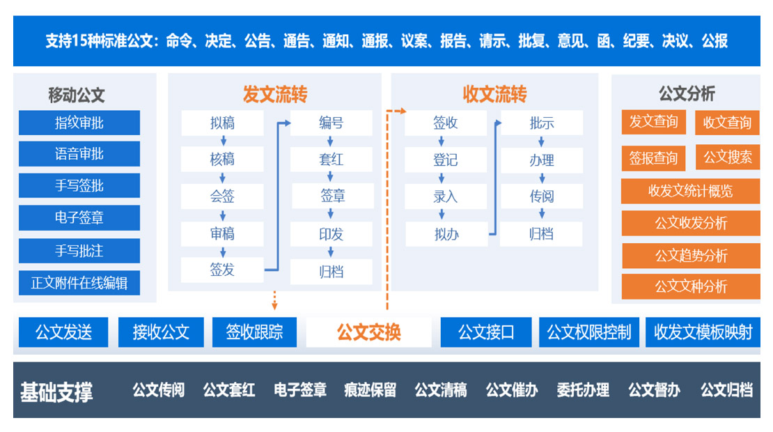 支持《黨政機(jī)關(guān)公文格式》(GB/T 9704-2012)規(guī)定的15類公文的起草,涵蓋擬稿、核稿、審稿、簽發(fā)、編號、排版、打印、分發(fā)、歸檔等工作
