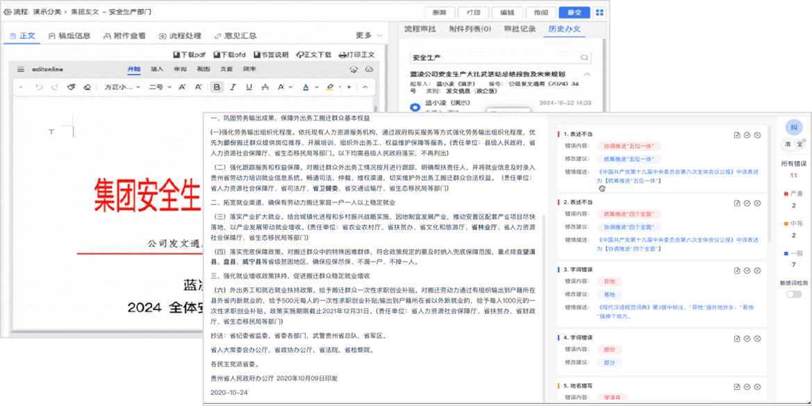提供公文起草、在線編輯、正文清稿、套紅打印、流程審批、公文發(fā)布等全周期管理
