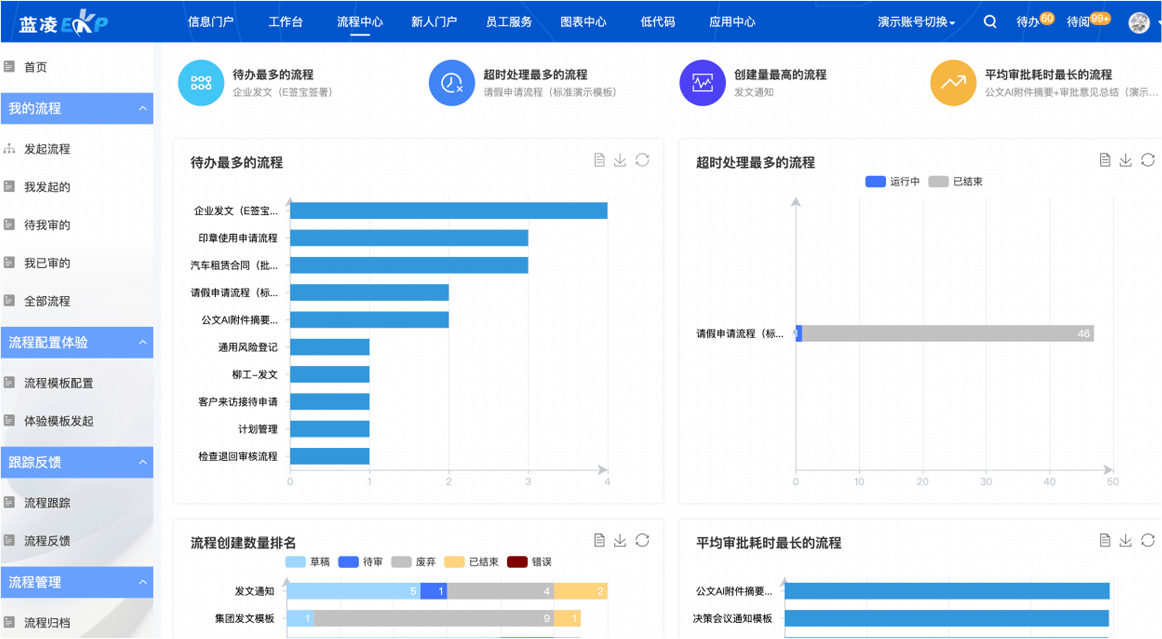 支持對(duì)流程運(yùn)行質(zhì)量、人員辦件效率、部門辦件效率等進(jìn)行分析,助力運(yùn)營持續(xù)優(yōu)化